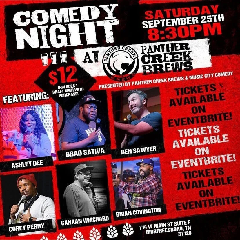 Live stand up comedy at Panther Creek Brews in Murfreesboro, TN. Hosted by Brad Sativa. Tickets are $12 and one beer is included with the purchase price. Click here for tickets.